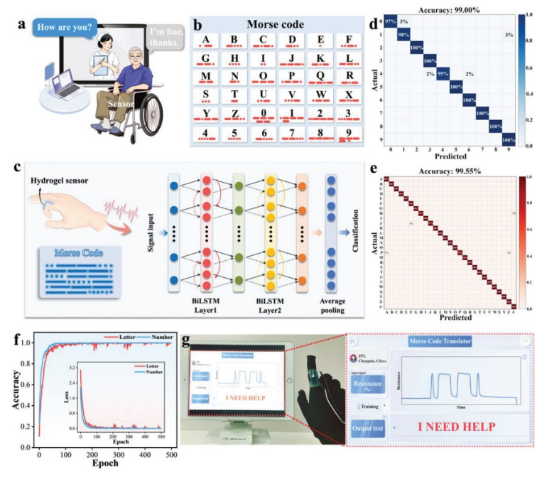 Fig 6. 可穿戴莫爾斯電碼識別和翻譯系統(tǒng)的應(yīng)用。 a)基于水凝膠傳感器的莫爾斯電碼翻譯系統(tǒng)的潛在應(yīng)用場景示意圖。 b) 摩爾斯電碼表,包括26個字母和10個數(shù)字。 c) BiLSTM模型的結(jié)構(gòu)。d,e) 分別識別 10 個數(shù)字和 26 個字母的混淆圖。 f) 分別識別10個數(shù)字和26個字母的準確率曲線和損失曲線。 g) 穿戴式摩爾斯電碼智能翻譯系統(tǒng)演示,將“我需要幫助”的摩爾斯電碼信號轉(zhuǎn)換為語音,并實時顯示在應(yīng)用界面上。