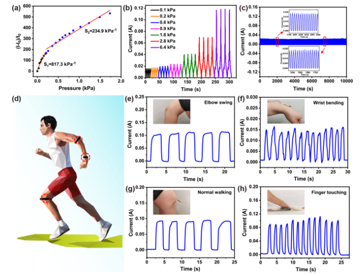 Fig 4. a相對電流的變化與壓力傳感器的線性靈敏度之間的關(guān)系。 b 0.1–6.4 kPa 各種壓力下的電流響應。 c 20% 應變下 2000 次循環(huán)的電流穩(wěn)定性。 d 人體行為監(jiān)測應用示意圖。 e 肘部擺動、f 手腕彎曲、g 正常工作、h 手指觸摸的電流信號。
