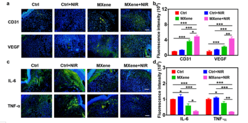 Fig 7. 免疫熒光分析。 (a) 7天時CD31和VEGF的免疫熒光圖像;比例尺 = 100 μm。 (b) (a) 的熒光強度。 (c) 3天時IL-6和TNF-α的免疫熒光圖像;比例尺 = 100 μm。 (d)(c)的熒光強度分析。統(tǒng)計顯著性通過 Students’ t-test獲得,*p < 0.05、**p < 0.01 和 ***p < 0.001。