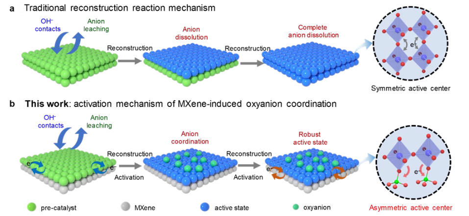 Fig 1. 傳統(tǒng)和現(xiàn)在的 HER 重構(gòu)反應(yīng)機制示意圖。 (a) 陰離子浸出導(dǎo)致預(yù)催化劑重構(gòu)。 (b) MXene 誘導(dǎo)的氧陰離子配位和活性相形成。