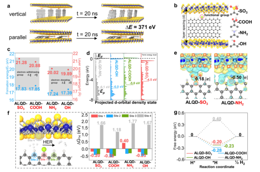 2 的 HER 活性。隨后,作者設(shè)計(jì)了一種功能化GQD誘導(dǎo)的原位自下而上策略,通過(guò)調(diào)節(jié)吸電子/供電子官能團(tuán)的濃度來(lái)制造以GQD(ALQD)介導(dǎo)的近原子層2H-MoS