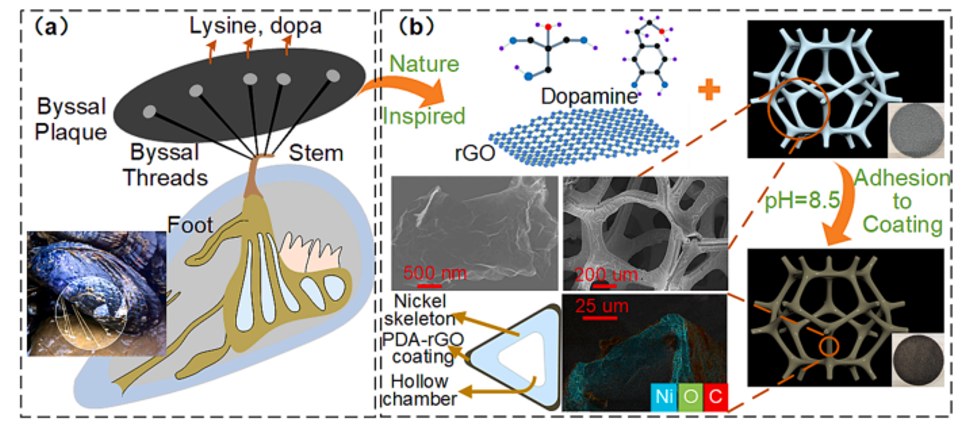 圖1. (a)強(qiáng)黏性貽貝的結(jié)構(gòu)及其具有黏性效應(yīng)的分泌蛋白;(b)仿貽貝的金屬泡沫涂層:將石墨烯粘附在鎳泡沫骨架上。