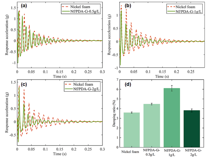 圖6. (a) Nf/PDA-G-0.5 g/L與泡沫鎳的振動衰減曲線比較;(b) Nf/PDA-G-1 g/L vs.泡沫鎳;(c) Nf/PDA-G-2 g/L vs.泡沫鎳;(d)第一階阻尼比。