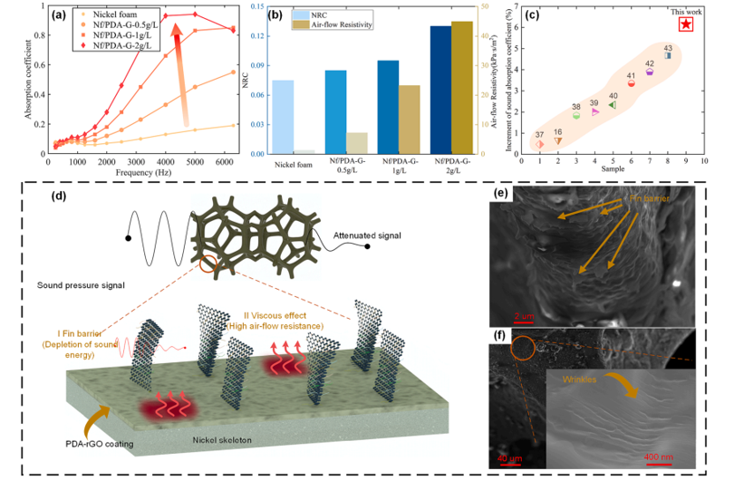 石墨烯涂層在多孔材料的骨架上打開了簡單實(shí)現(xiàn)高性能復(fù)合材料的大門。本研究依托聚多巴胺(PDA)的黏附性能,將PDA改性的還原型氧化石墨烯(PDA-rGO)黏附在泡沫鎳的骨架上,研究其力學(xué)性能以及減振和吸聲性能。力學(xué)測試結(jié)果表明,涂層的存在使材料的壓縮模量和屈服強(qiáng)度分別提高了240%和59%。動態(tài)力學(xué)分析(DMA)也驗(yàn)證了動態(tài)力學(xué)性能的提高。此外,在DMA測試中發(fā)現(xiàn),涂覆了PDA-rGO的泡沫鎳的損耗因子可以達(dá)到170%的增長率,并且隨著溫度的升高表現(xiàn)出優(yōu)異的穩(wěn)定性,表明在惡劣環(huán)境下?lián)p耗因子提高的可靠性。振動試驗(yàn)進(jìn)一步證實(shí)了鍍有PDA-rGO的泡沫鎳具有良好的減振性能。此外,該涂層有效地提高了泡沫鎳的流動阻力和吸聲能力,這一協(xié)同作用使降噪系數(shù)顯著提高了73.3%。因此,在本研究中,將PDA-rGO粘附在泡沫鎳上,為開發(fā)多功能和多用途的泡沫金屬提供了一種有前景的策略