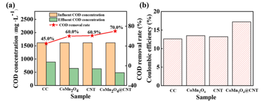 微生物燃料電池(MFCs)利用電活性微生物(EAMs)從有機(jī)廢水中回收電能,用于廢水處理和發(fā)電。然而,相對(duì)較低的功率輸出密度目前阻礙了MFCs的商業(yè)應(yīng)用。主要原因是陽(yáng)極界面微生物負(fù)荷低和細(xì)胞外電子傳遞(EET)緩慢。提高eam在陽(yáng)極上的負(fù)載和EET效率被認(rèn)為是提高mfc整體性能的有效策略。與原始碳布(CC)陽(yáng)極相比,CoMn