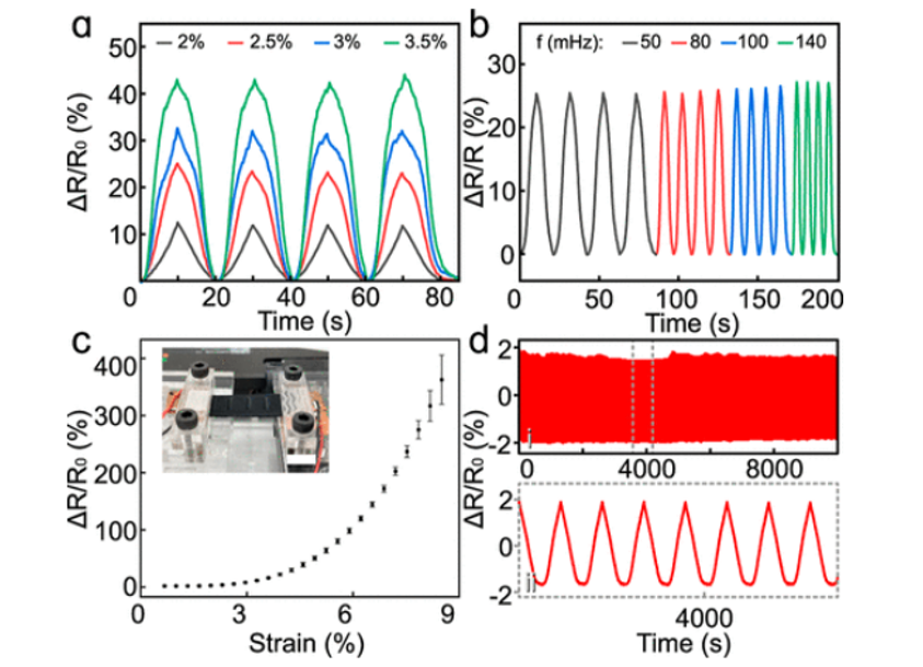 圖2.LIG應變傳感器的特性。(A)阻力隨時間的變化,表現(xiàn)出穩(wěn)定性和敏感性。(B)電阻隨時間的變化,描述頻率靈敏度。(C)電阻與應變圖的變化,描繪了傳感器靈敏度(標尺=1厘米)。(D)測量LIG應變傳感器在1000個循環(huán)內的重復性。
