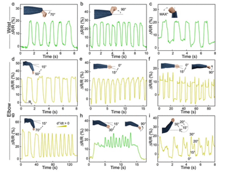 圖3.LIG應變傳感器在運動跟蹤中的應用。(a–c)屈曲(a)、伸展(b)和尺骨偏斜(c)的手腕運動波形。(d–i)屈曲(d)、伸展(e)、伸展和仰臥(f)、隨著屈曲率增加而屈曲(g)、伸展與手腕仰臥(h)的肘部運動波形,以及包含部分重復的二頭肌卷曲類似物(i)。