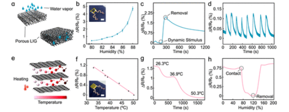 圖4.LIG濕度和溫度傳感器的特性。(a) 水蒸氣滲透到多孔LIG中會引起電阻變化。(b) 電阻隨相對濕度的變化。(c) LIG濕度傳感器在暴露于大刺激和(d)小刺激時的動態(tài)響應。(e) 由溫度變化引起的LIG結構內原子的運動性。(f) 校準圖和(g)基于LIG的溫度傳感器在生理溫度范圍內的動態(tài)響應。(h) LIG溫度傳感器在與人體接觸和從人體移除時的動態(tài)響應。(所有比例尺=5 mm)。