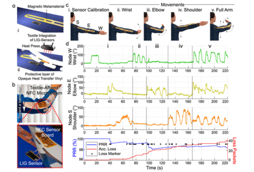 圖5.通過基于LIG的“智能”無電池服裝進行多節(jié)點姿勢監(jiān)測。(a) 諧振器和紡織LIG傳感器的制造和集成示意圖。(b) 在肩膀、肘部和手腕上安裝LIG應變傳感器,連接到NFC集線器,并通過紡織品集成波導進行無線通信。(c) 人類受試者的運動產生(d)傳感器數(shù)據(jù),顯示手腕、肘部和肩部的順序彎曲,然后同時彎曲所有三個關節(jié)。