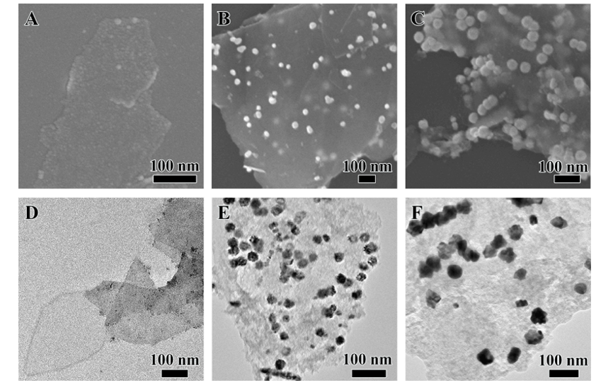 圖1. 制備的(A,D) MXene、(B,E) MXene- rGO - Au和(C,F) MXene- AuPd納米復合材料的SEM和TEM圖像。