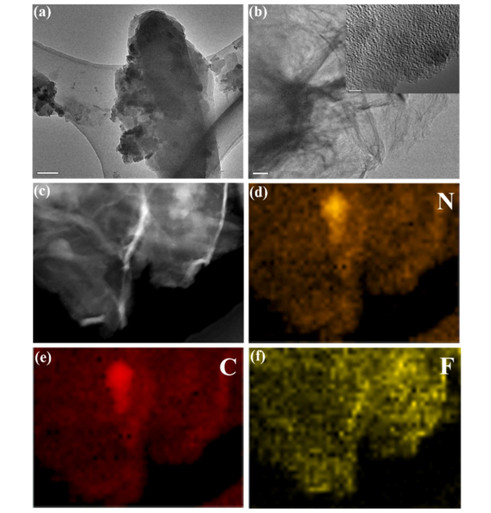 圖2. (a) FGi樣品剝落前的TEM圖像,(b) FG/CTAC納米片樣品剝落后的TEM和HR-TEM圖像,(c-f) FG/CTAC樣品剝落后的TEM圖像及相應(yīng)的元素映射圖像