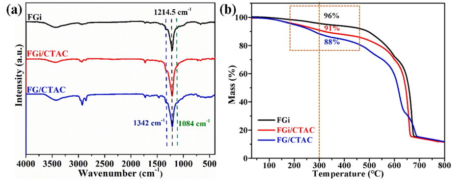 圖3. (a) FGi/CTAC剝離前和FG/CTAC剝離后對應(yīng)的FT-IR吸收光譜和(b) TG曲線。