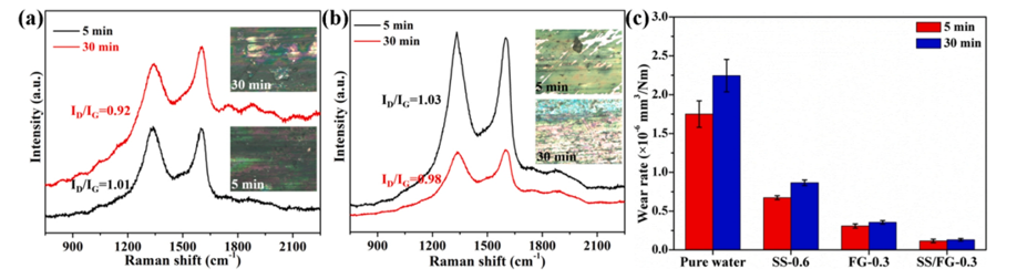 圖8. (a) FG/CTAC和(b)添加潤滑劑的SS/FG潤滑黃銅基片,摩擦5min和30 min后形成的潤滑膜的拉曼光譜, (c)在設(shè)定條件下(20 N, 2 Hz, 6 mm)添加不同添加劑的潤滑劑經(jīng)過不同摩擦次數(shù)后的磨損率比較。