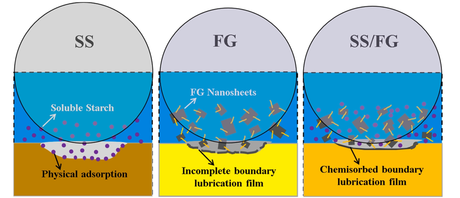 本研究設(shè)計了一種具有優(yōu)異減摩和抗磨性能的可溶性淀粉(SS)和物理改性氟化石墨烯(FG)的混合添加劑體系,以滿足未來對水基潤滑的需求。采用表面活性劑對氟化石墨進(jìn)行高速剪切剝落,得到了具有兩親性的改性FG納米片。改性后的FG通過形成邊界潤滑膜,顯著提高了水基潤滑劑的承載性能和邊界潤滑性能,而SS進(jìn)一步提高了減摩性能和邊界潤滑膜的形態(tài)性能,特別是在磨合期間。在最佳比例(0.3 wt% FG和0.6 wt% SS)下,混合潤滑油協(xié)同降低相應(yīng)的摩擦系數(shù)和磨損率約90%。