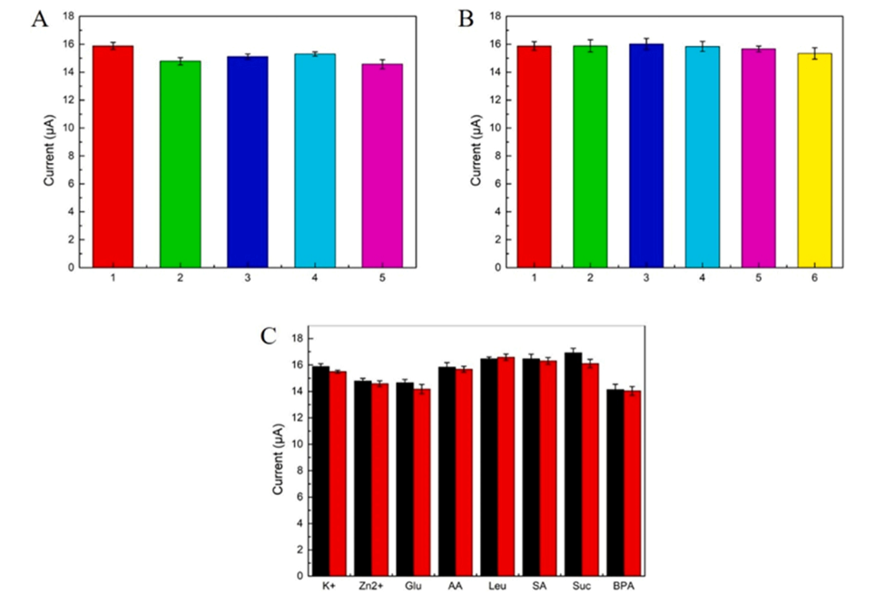 圖6. (A) 5個(gè)電極在相同條件下的重復(fù)性研究。(B)相同條件下六種平行測(cè)定方法的穩(wěn)定性研究。(C)一些可能的干擾物質(zhì)對(duì)PBS溶液中5μm DA測(cè)定的影響。