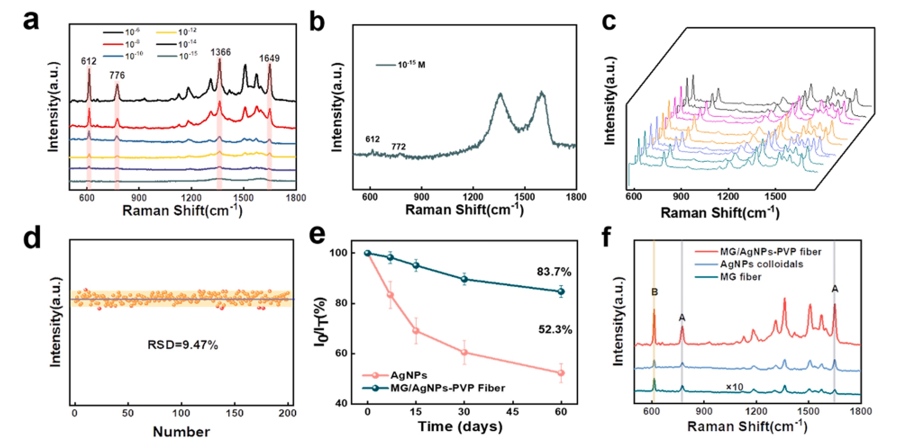 -1處拉曼信號強(qiáng)度隨MG/AgNPs-PVP纖維及其AgNPs-PVP膠體儲(chǔ)存時(shí)間的衰減。(f) MG纖維、單層AgNPs納米結(jié)構(gòu)和MG/AgNPs- PVP纖維中R6G的SERS光譜。