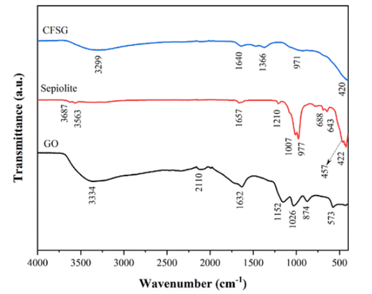 圖1. GO、海泡石和CFSG的FTIR光譜。