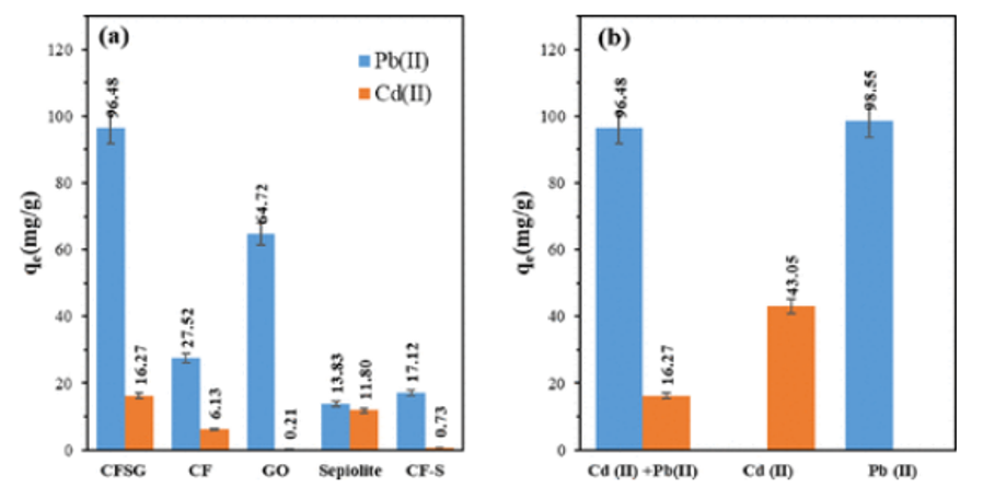 圖5.(a) 用不同的吸附劑篩選Pb(II)和Cd(II)的去除,以及(b)在CFSG上的二元和單金屬吸附。