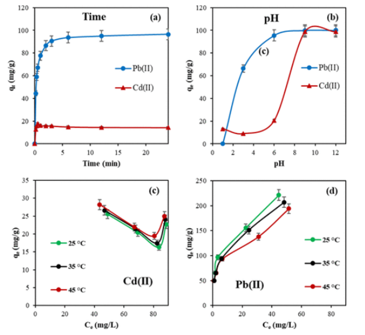 圖6.(a)接觸時(shí)間、(b)pH和溫度對(duì)(c)Cd(II)和(d)Pb(II)吸附的影響。