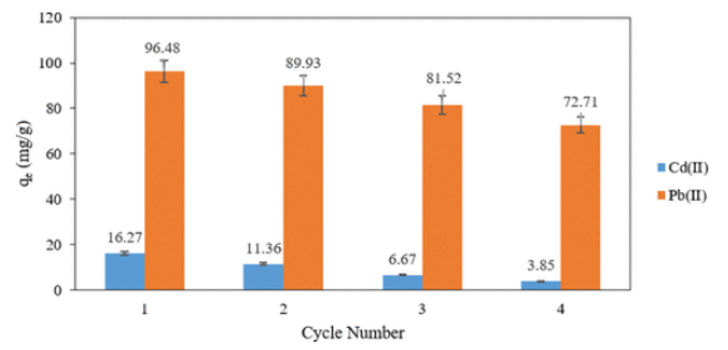 4/海泡石/GO(CFSG)納米復(fù)合材料。使用TEM、FTIR、SEM–EDX、XRD和TGA技術(shù)對(duì)合成的納米復(fù)合材料進(jìn)行了表征,以確定其組成、結(jié)構(gòu)和熱穩(wěn)定性。利用合成的CFSG納米復(fù)合材料對(duì)水溶液中Pb(II)和Cd(II)重金屬離子的吸附去除進(jìn)行了研究。研究了CFSG負(fù)載量、pH、接觸時(shí)間和溫度等吸附參數(shù)。在Pb(II)和Cd(II)二元體系中,CFGS納米復(fù)合材料顯示出比Cd(II。Pb(II)和Cd(II)的吸附符合Langmuir模型,其次是偽二階模型,并且是自發(fā)的。吸附熱力學(xué)分析表明,Pb(II)的吸附過(guò)程為放熱過(guò)程,Cd(II)吸附過(guò)程為吸熱過(guò)程。CFSG表面的CuFe
