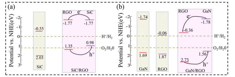 圖5. 計(jì)算了SiC和GaN單層氫電極的VBM和CBM電位。顯示了SiC/RGO異質(zhì)結(jié)和GaN/RGO異質(zhì)結(jié)中載流子的轉(zhuǎn)移和分離。