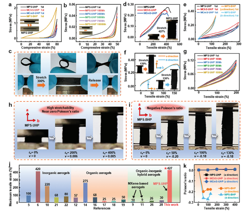 圖3. 可拉伸MXene基氣凝膠的力學(xué)性能。