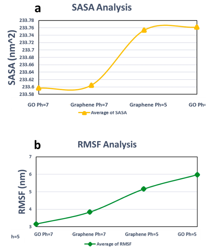 圖5. 含DOX藥物的氧化石墨烯(GO)和石墨烯在pH=7和pH=5時(shí)的SASA和RMSF分析的平均值:(a)平均SASA,(b)平均RMSF。