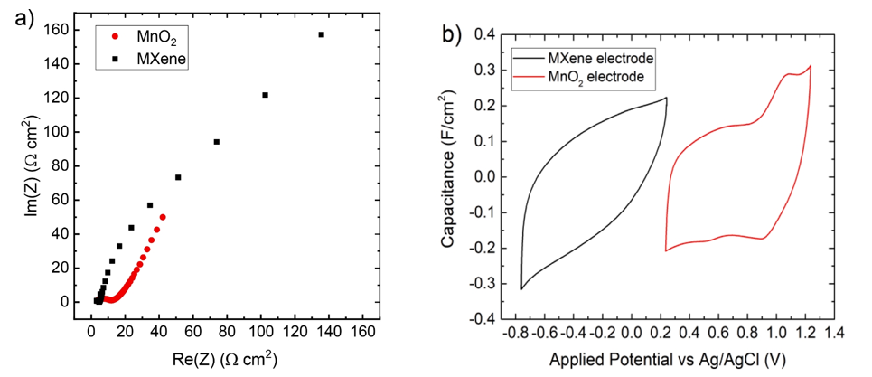 在過去的幾年里,物聯(lián)網(wǎng)已經(jīng)成為一個重要的技術(shù)、社會和經(jīng)濟話題。其中一個主要影響是小型儲能設(shè)備對能量和功率密度的高需求。在該領(lǐng)域,激光誘導(dǎo)石墨烯(LIG)已成為制造柔性微型超級電容器的一種很有發(fā)展前景的材料。這種材料的性能局限性在于其有限的表面積和相對較低的導(dǎo)電性。在這項工作中,我們通過電泳修飾其表面來提高LIG超級電容器的性能:一個電極將用金屬氮化物和金屬碳化物(MXenes)修飾,另一個電極用氧化錳修飾。這兩種材料具有可觀的電導(dǎo)率和贗電容。在兩個電極上分別進行了電化學(xué)測量。充電平衡后,將設(shè)備密封在袋中進行測試。