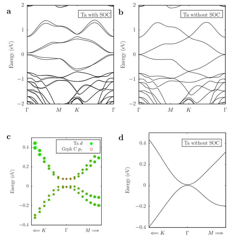 圖3. Ta-嵌入外延石墨烯的電子能帶結(jié)構(gòu)。(a)有SOC和(b)沒有SOC的Г附近能帶結(jié)構(gòu) (c) 具有和(d)不具有SOC。