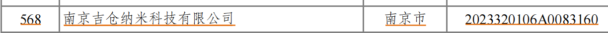 據(jù)科小網(wǎng)消息,我司南京吉倉納米科技有限公司被列入江蘇省2023年第八批入庫科技型中小企業(yè)名單。