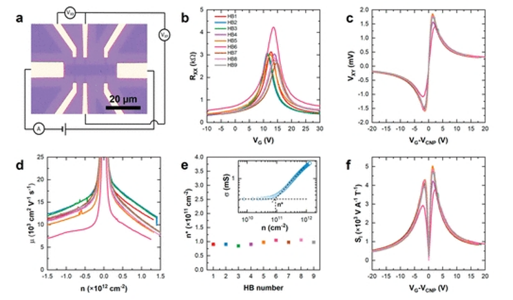 在這項工作中,本研究展示了通過采用單層單晶化學(xué)氣相沉積(CVD)石墨烯陣列制造的高靈敏度和可擴(kuò)展的霍爾傳感器。該器件基于石墨烯霍爾棒,載流子遷移率>12000 cm