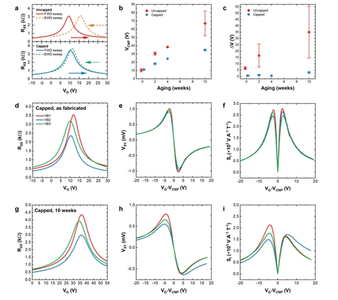圖3. 沒有和有PMMA封裝的石墨烯霍爾棒的電學(xué)特性。(a)電阻率測量作為外加?xùn)艠O電壓函數(shù)的遲滯。(上圖)未封頂大廳酒吧:向前(紅色實(shí)線)和向后(橙色虛線)后門掃。(下)PMMA覆蓋的大廳條:向前(藍(lán)色實(shí)線)和向后(綠色虛線)后門掃描。(b) CNP的位置和(c)未封頂(紅色)和封頂(藍(lán)色)石墨烯器件的滯回率隨老化時間的變化。(d - f) PMMA封裝后芯片3的電性能,顯示電阻(d)、霍爾電壓(e)和電流相關(guān)靈敏度(f)作為外加?xùn)艠O電壓的函數(shù)。(g - i)芯片3老化10周后的電性能,顯示電阻(g)、霍爾電壓(h)和電流相關(guān)靈敏度(i)隨外加?xùn)艠O電壓的變化。
