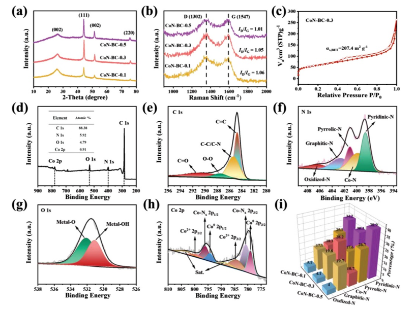 2吸附/解吸等溫線。 d) CoN-BC-0.3 的調查 XPS 光譜和 (e) C 1s、f) N 1s、g) O 1s 和 h) Co 2p 的高分辨率光譜。 i) CoN-BC-x 中各種氮形態(tài)的含量。