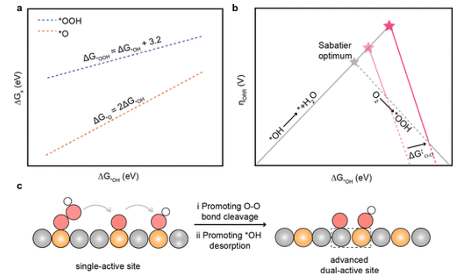 ‡ O−O 代表 O−O 裂解的能壘。 (c) 先進(jìn)的雙活性位點(diǎn),可解耦直接 O−O 鍵斷裂和 *OH 解吸。