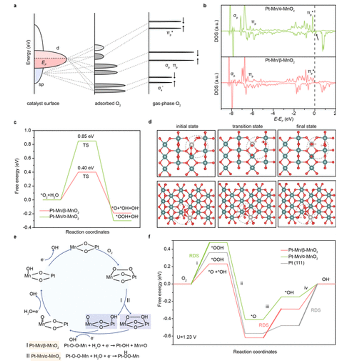 2在催化劑表面吸附的分子軌道示意圖。 (b) Pt−Mn/α-MnO