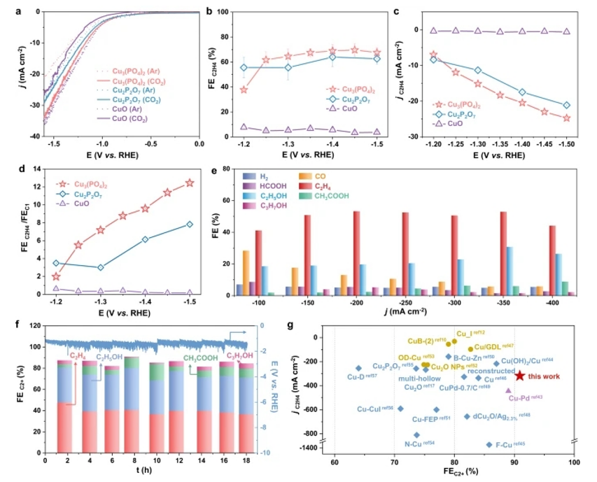 2+ 選擇性被限制在 90% 以下。在此,確定了源自磷酸銅基(CuPO)電催化劑的穩(wěn)定的Cu