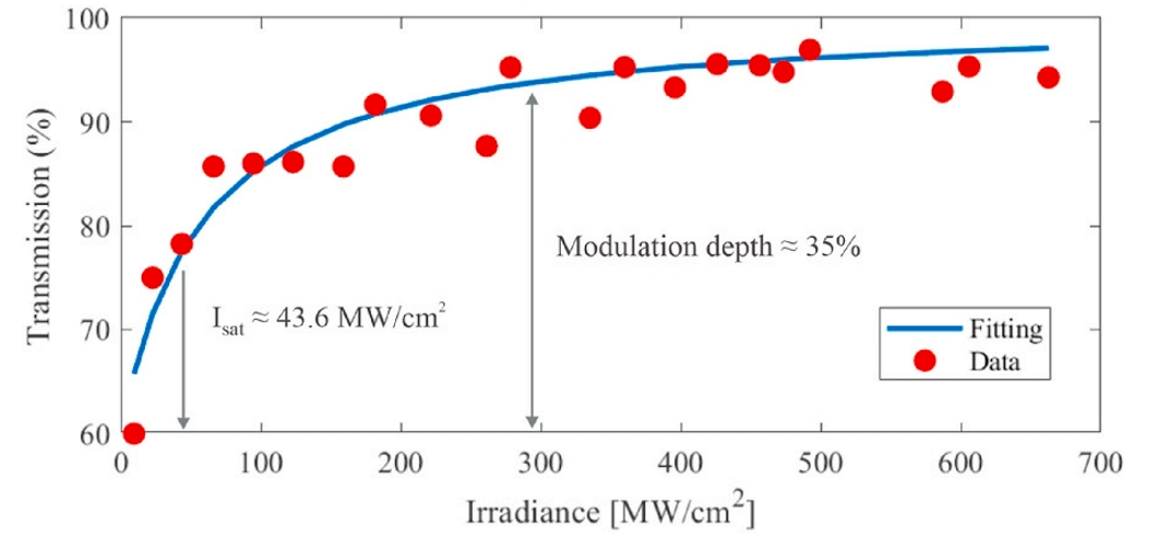 圖5. GOQDs光沉積在光纖上的非線性傳輸曲線。