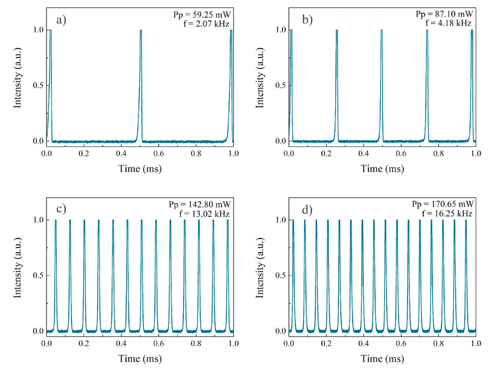 圖7. 不同泵功率下調(diào)q激光輸出脈沖串的跡線:a) 59.25 mW, b) 87.10 mW, c) 142.80 mW, d) 170.65 mW。
