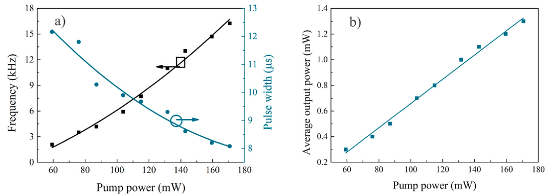 圖8. a)頻率和脈寬與入射泵功率的函數(shù)關(guān)系;b)輸出功率與泵功率的函數(shù)關(guān)系。