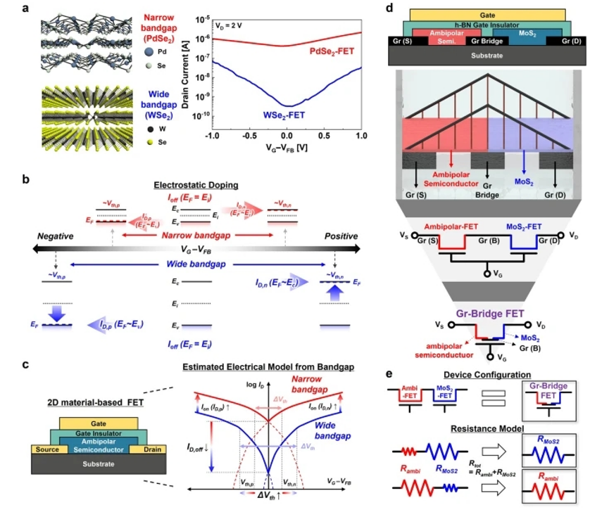 Fig 1. (a) 雙極PdSe?和WSe? FET的原子晶體結(jié)構(gòu)和ID-VG轉(zhuǎn)移特性曲線; (b) 雙極半導(dǎo)體中Eg, Vth和ID之間關(guān)系示意圖;(c) 二維雙極半導(dǎo)體FET基于不同能帶隙的谷狀估計轉(zhuǎn)移模型;(d) Gr橋異質(zhì)結(jié)構(gòu)器件的概念器件原理圖和電子元件符號;(e) Gr 橋場效應(yīng)晶體管的器件結(jié)構(gòu)及串聯(lián)電阻模型。