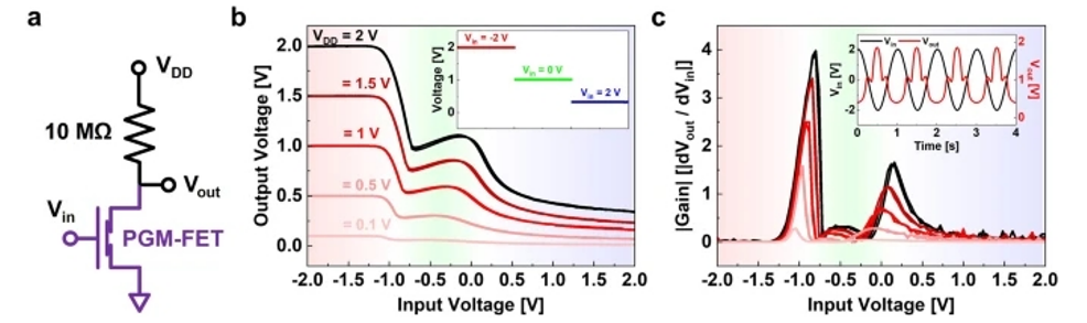 Fig 3. (a) 基于PGM - FET的電阻負(fù)載逆變器多值邏輯電路應(yīng)用電路圖;(b) 0.1-2v VDD基于PGM - FET的多值邏輯運算的VTC特征曲線,插圖顯示了三種不同的輸出狀態(tài);(c) 所演示的VDD三元逆變邏輯電路的電壓增益范圍為0.1 V至2 V,插圖顯示了正弦波形Vin的動態(tài)Vout響應(yīng)。