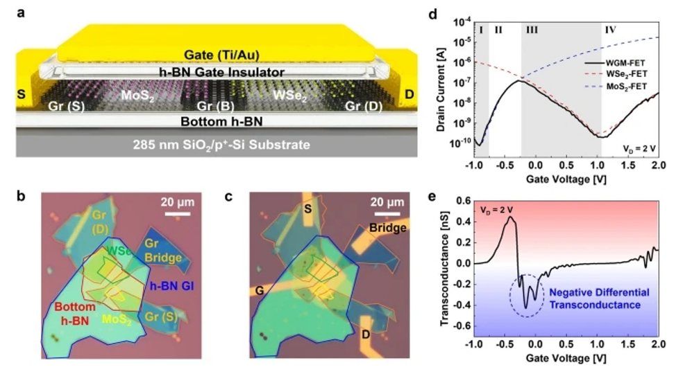 Fig 4. (a) 用于頻率三倍器電路應(yīng)用的WGM-FET的橫截面3D器件示意圖;(b)(c)圖案化前后WGM-FET的OM圖像;(d) MoS?-FET、WSe?-FET和WGM-FET的ID-VG傳輸特性曲線;(e)從(d)得到的WGM-FET的估計跨導(dǎo)。