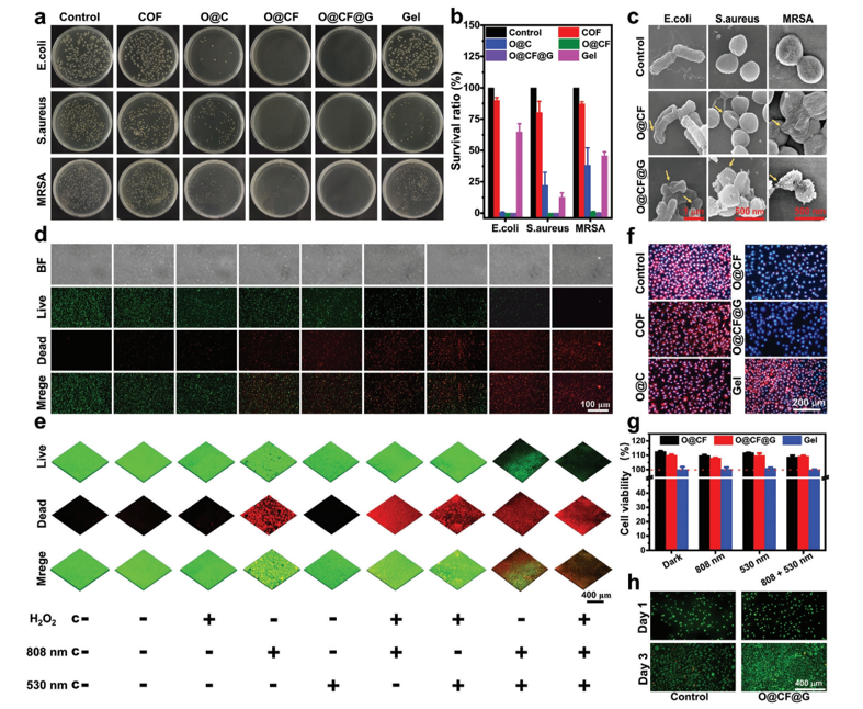 Fig 6. a) 瓊脂板圖像和 b) 與不同制劑在 37 ℃下孵育 2 小時(shí)后大腸桿菌、金黃色葡萄球菌和 MRSA 的相應(yīng)抗菌比率。 c) 與不同制劑一起孵育 2 小時(shí)的大腸桿菌、金黃色葡萄球菌和 MRSA 的 SEM 圖像。箭頭顯示破裂的膜和流出的細(xì)胞質(zhì)。 d,e) 不同處理下與O@CF@G一起孵育的MRSA細(xì)菌和MRSA生物膜(放大倍數(shù)=15×)的活死染色CLSM圖像(放大倍數(shù)=40×),其中“c-”代表對(duì)照組沒(méi)有任何材料(BF:明場(chǎng),綠色:活,紅色:死)。 f) 用不同制劑孵育的 L929 細(xì)胞的細(xì)胞內(nèi) O