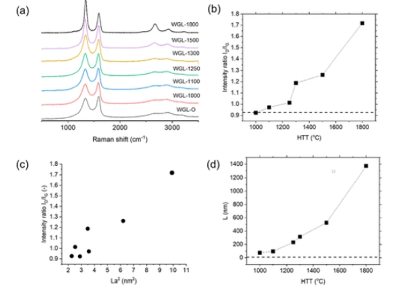 圖5. 通過(a)C1s光譜、(b)π–π*振蕩衛(wèi)星峰和(C)紅外光譜表征WGL HTs的石墨層尺寸。曲線圖顯示(d)A