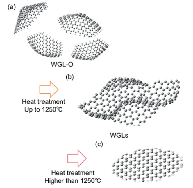 G的關(guān)系。(d) 通過程序升溫脫附(TPD)測量評估石墨層尺寸(L)。(b)和(d)中的虛線表示W(wǎng)GL-O的值。