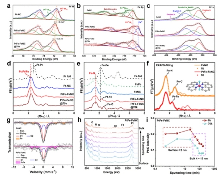 57Fe穆斯堡爾譜。(h) PtFe-FeNC的HS-LEIS光譜。(i) Pt/C強(qiáng)度比隨濺射時(shí)間的變化。