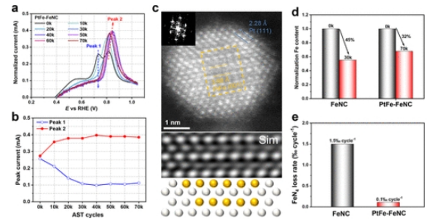 圖4. ASTs后PtFe-FeNC的結(jié)構(gòu)特征。(a) 不同循環(huán)下的歸一化CO汽提曲線。(b) 峰值1和峰值2在不同周期的對應(yīng)峰值電流。(c) AC-HAADF-STEM圖像PtFe-FeNC@70k具有沿著[111]區(qū)軸的模擬STEM圖像和原子模型(白色和黃色球體分別表示Pt和Fe)。(d) AST后FeNC和PtFe-FeNC的歸一化Fe含量。(e) FeNC和PtFe-FeNC每循環(huán)的FeN