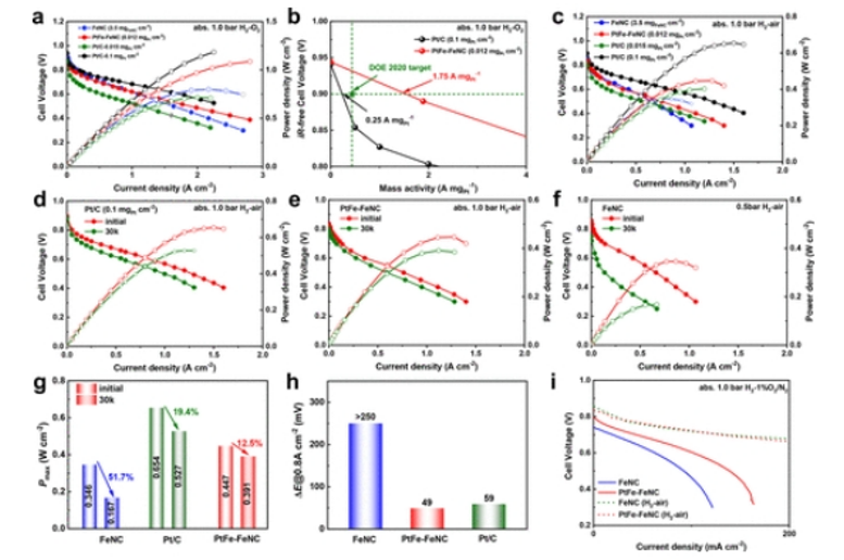 2產(chǎn)量。(b) FeNC、Pt-NC、PtFe-FeNC和JM20%Pt/c在0.9V(相對于RHE)下的Tafel曲線和(c)MA。(d–f)FeNC(d)、Pt/C(e)和PtFe-FeNC(f)30k后的ORR極化曲線。(g–i)FeNC(g)在0.8 V(vs RHE)時(shí)的對應(yīng)jk和Pt-NC(h)和PtFe-FeNC(i)在0.9 V(vs RHE)下的對應(yīng)MA。