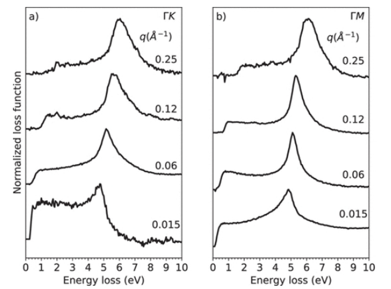 圖2. 測量了沿ΓK(a)和ΓM(b)方向取向的不同動量轉(zhuǎn)移q的獨(dú)立石墨烯的低能量損失譜。零損耗峰值已被刪除。