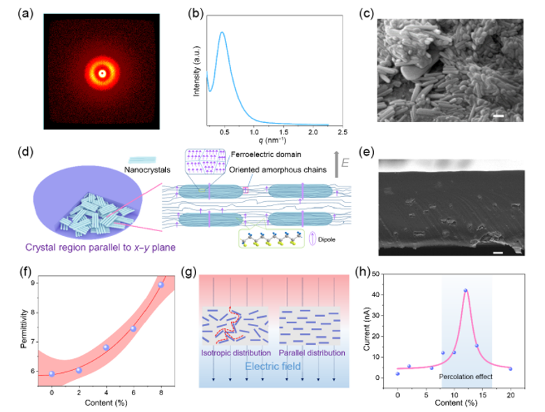 隨著對柔性壓電傳感器元件需求的不斷增加,基于聚偏二氟乙烯(PVDF)的壓電聚合物的研究也越來越多。然而,PVDF的低偶極極化和無序極化方向阻礙了壓電性能的進一步提高。在本研究中,我們通過溫度-壓力雙場調控方法,在MXene/PVDF納米復合材料中構建了由分子鏈、結晶區(qū)和MXene片組成的定向三級結構。高度定向的PVDF分子鏈形成約90%的β相。此外,具有長程取向的晶體區(qū)域結構實現了平面外極化取向。MXene的平行取向排列有效地增強了納米復合材料的壓電性能,器件的電流輸出提高了近23倍。這種高輸出的設備用于監(jiān)測運動動作,探索可穿戴電子設備的潛在應用。